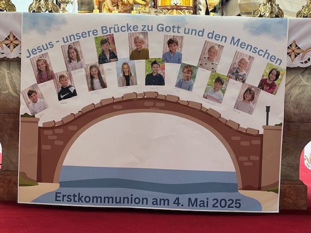 Eine Brücke verbindet. Von der einen Seite zur anderen Seite. Zu Gott, unserem Vater, zu unseren Freunden, zu unseren Mitmenschen. Das Kreuz ist Symbol für die Verbindung von uns über Jesus zu Gott. Der Querbalken stellt die Brücke von Jesus zu uns Menschen dar. Pfarrer Robert bespricht diese Brücke mit unseren 16 Kindern der Erstkommunion am Sonntag, 4. Mai 2025. Er spendet mit einer sehr persönlichen Anrede jedem Kind mit der Heiligen Kommunion Jesus, die Brücke zu unserem Vater: "Empfange zum ersten Mal in Deinem Leben den Leib Christi!"
